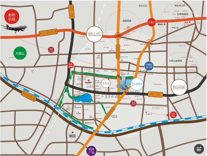 安粮国贸购物中心位于安徽省合肥市蜀山区金寨南路 811 号(金寨南路与南二环交口西北角),为政务、蜀山与包河三区交汇的黄金核心,南二环、金寨路及合作化路三大主干道交汇的稀缺区位。合肥市政府政务中心、奥体中心、合肥大剧院等构筑起集政务办公、文化演艺、体育盛会、高端商务于一体的复合型价值生态圈,为项目注入源源不断的消费动能与品质客群。