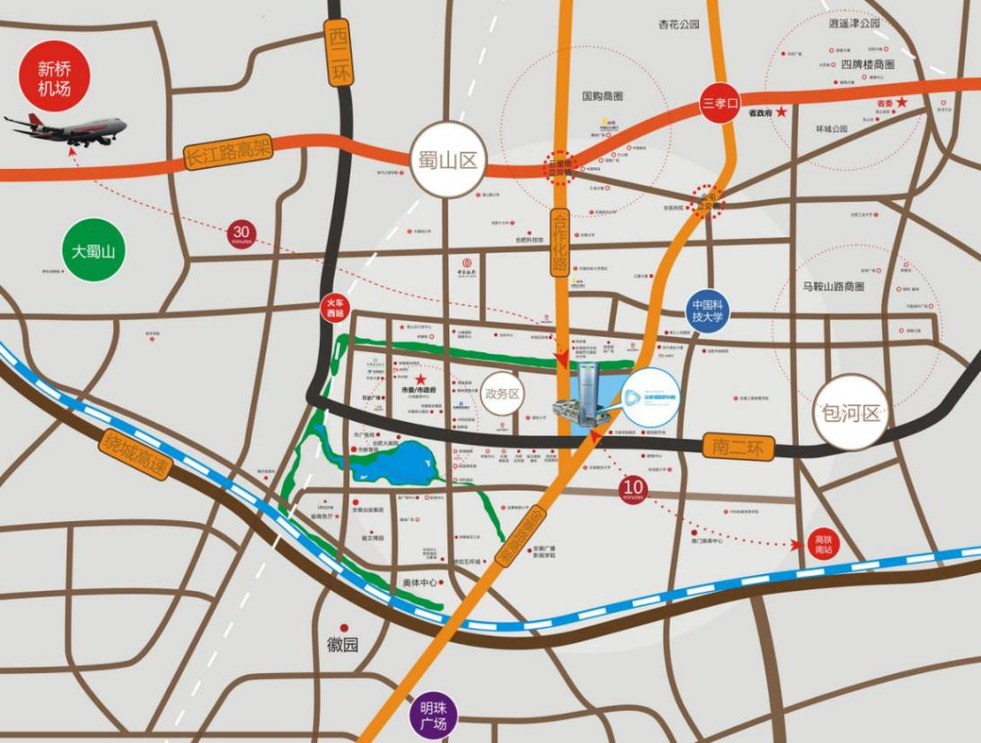 安粮国贸中心位于安徽省合肥市蜀山区金寨南路 811 号(金寨南路与南二环交口西北角),为政务、蜀山与包河三区交汇的黄金核心,南二环、金寨路及合作化路三大主干道交汇的稀缺区位。合肥市政府政务中心、奥体中心、合肥大剧院等构筑起集政务办公、文化演艺、体育盛会、高端商务于一体的复合型价值生态圈,为项目注入源源不断的消费动能与品质客群。